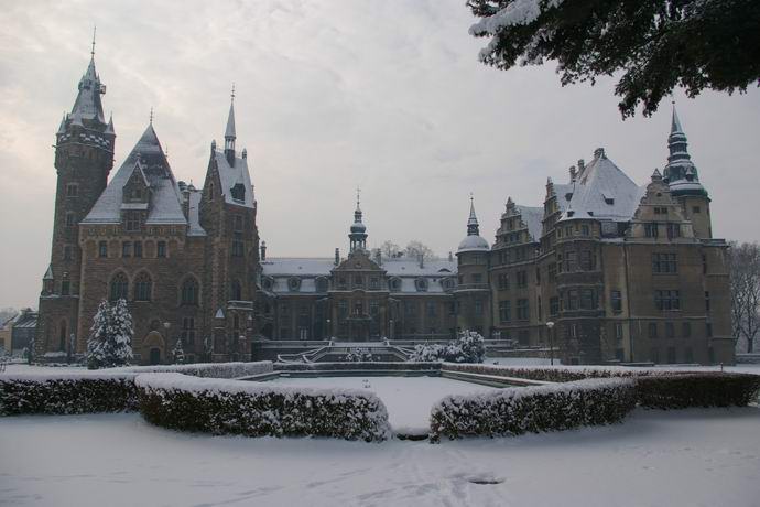 A Moshni kastély építészeti sokfélesége nem hagyja közömbösen senki sem. Középső része barokk stílusban épült, keletre a szárny neogótikus stílusban, a nyugati stílusban készül Renaissance. A palotát a tizenhetedik században építették, de az többször felújították és újjáépítették. Sok éves kastély a Thiele-Winkler család tulajdonában van. Ma a palota és a park az együttes továbbra is magántulajdonban van. az egy bizonyos időben felár ellenében felkereshető.