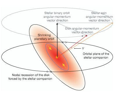 Fotó nyílt forrásból, Konstantin Batygin csillagász szerint a Harvard-Smithsonian Asztrofizikai Központból (Cambridge, Massachusetts) a Nature folyóiratból, ez az elmélet magyarázza az okot, mert amelyet a föld 7 fokos szögben a nap körül forog a Naprendszerhez viszonyítva. Konstantin elmélete ezt jelzi fiatal csillagok alakulhatnak ki klaszterekben, anyaglemezekkel, körülveszik őket, és szinte mindig az Egyenlítőn oszlanak el, azaz egy közeli csillag vonzza. További protoplanetáris lemezek képesek egy második csillag távolítja el az egyenlítői pályáról. Azt hiszi a gazember csillag már régen eltűnt, és valószínűtlen, hogy visszatér. A Nature folyóiratban Batygin azt írja, hogy a gáznemű óriási bolygók léteznek, amelynek pályája a házigazda csillag közelében fekszik (“forró Jupiter”), nagyrészt a bolygók vándorlásának tulajdonítható, a protoplanetáris köd viszkózus fejlődésével jár. új a Rossiter – McLaughlin-effektus megfigyelése a bolygók áthaladása közben, megmutatta, hogy a forró Jupiter jelentős frakciói vannak bekapcsolva pályák, amelyek eltolódnak a csillag forgástengelyéhez képest – a tulajdonos. Ez a megfigyelés megkérdőjelezi a menedzselhetőség fontosságát. meghajtó migráció, mint a meleg előfordulásának mechanizmusa Jupiter. A probléma geometriai ábrázolása. Ezek az adatok vázlatosan ábrázolni a “egyenetlen” előfordulását a közeli bolygók lemezmeghajtású migráció révén binárisan rendszereket. Egy öngravitáló korong adiabatikus reakciója A műholdas csillagok hosszú távú zavara recesszióhoz vezet emelkedő csomópont, a pálya síkja szerint csillag társ. A lemez szögmozgató vektorának recessziója a csillagok bináris orbitájának szögmozgására vonatkoztatva úgy tűnik, hogy a szögmozgás a tengely közötti szög elmozdulásához vezet a csillag és a lemez forgása a csillag referenciakeretében.