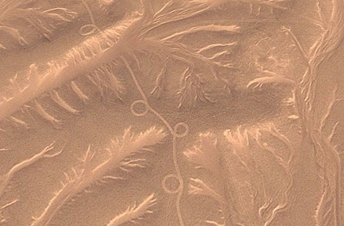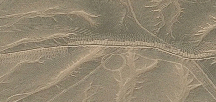 Ma a Google Earth Online segítségével láthatja Egyiptom, a környező homok és gyakorlatilag bepillant bennük. alatt könnyű felfedezni fantasztikus homokot egy titokzatos dísz, amelyet nyilvánvalóan nem a természet készített, de nem világos ki és milyen célra. A homok alatt, mint kiderült, van egy tömeg mindenféle vonal, egyenes, ívelt, egyfajta hurkot képez vagy bizonyos karakterekben fejlődik. Sőt, mindezen hurkok és a kacsa csak hatalmas, az űrből néznek ki miniatűr. A földön ezek kilométer kanyarok és sorok százak számára kilométert.