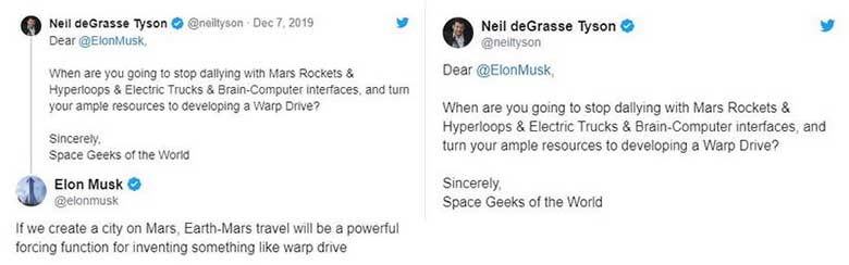 Jól ismert asztrofizikus Neil de Grass Tyson (Neil Grasse Tyson) felszólította Elon Musket, hogy hagyjon fel szokásos helyzetével olyan projektek, mint a SpaceX, a Tesla, és kezdjék el létrehozni lánchajtómű, vagyis egy csillagközi hajtómotor, amely képes rakéta sebességének fejlesztésére az űrben, amely messze meghaladja a fénysebesség.