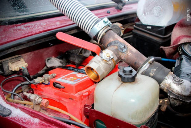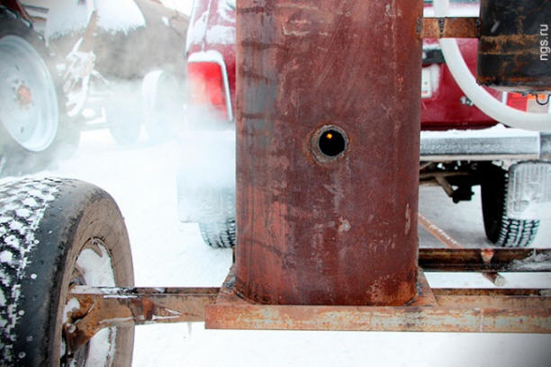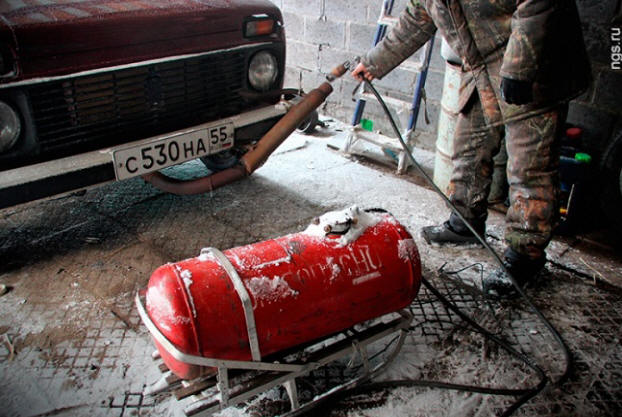 Фото изnyílt források A gép felmelegítéséhez egy cső nem elég: szüksége van vegye ki az égőt. A szerepe egy gázpalack volt, amelyhez csatlakozik egy gumi tömlő fegyverrel a láng táplálására a cső. Buzenius szerint 5 perc elég lesz a fagyálló ing melegítése.