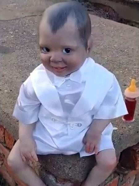 Egy kellemetlen mosolygós, éles fogakkal fedezett babát fedeztek fel Ismeretlen nő az egyik temetőben Brazíliában. Ijesztő játék fehér ruhában ült közvetlenül a sírkőnél és a közelében gyanúsan volt egy vörös folyadékkal ellátott bébi üveg hasonló a vérhez. A brazil a szokatlan leletről készít képet fényképezőgép, és a kapott videó gyorsan elterjedt az egész Világháló.