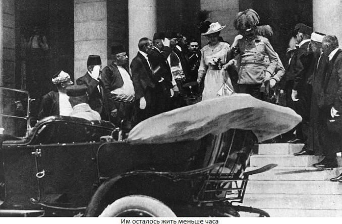 A gránát lepattant a tetejéről és felrobbant a következő kerekek alatt gépen. 20 ember sérült meg, de az főherceg nem. A szertartás után A városháza, Franz Ferdinand és felesége a kórházba látogatott a gyilkossági kísérlet során érintett. Ismét a sétány mentén mentünk, ahol a motorkerékpár a Gavrilo Princip-ra várt. Két barnuló lövés – két holttest: Főherceg és felesége.