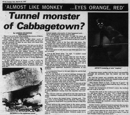 1976-ban egy torontói Kubbajtown körzetben egy 51 éves férfival Ernest (a vezetéknevet nem jelezték a sajtóban) elképesztő dolog történt a történet. Egy ember, kezében egy zseblámpával, felmászott egy földalatti alagútba Keresse meg a hiányzó cicát. Csak 10 lábnyira sikerült előrehaladnia (körülbelül 3 méter), ahogy valaki kiugrott a sötétségből furcsa lény. Ernest hosszú, sovány és egy három lábfejes fogazott majom, szürke prémmel borítva. nagy a teremtmény szemei erős narancssárga fénnyel megégették, félelmetesen Ernest.