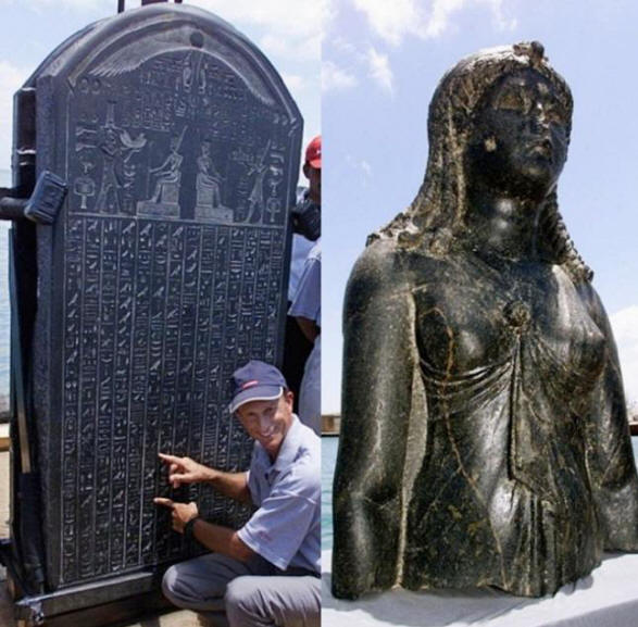 Fotók nyílt forrásból a búvárok nagyon nagynak találtak rózsaszín gránitszobrok, amelyek víz alatt fekszenek, mintha leszerezték volna ismeretlen hatalom talapzatai. A szobrok között találtak és Cleopatra képe, a görög-egyiptomi stílusban készült. ezt a királynő szobra egykor a város székesegyházában, Amun-Gerebben volt. Csak a királynő szobra után feküdt a sötét iszapban kétezer évvel, újra meglátta a fényt: a szobrot fentről emelték öböl a felszínre. Tíz méteres métert is találtak itt. szobor Hapi – a termékenység és a Nílus áradásainak istene. Az alján feküdt arccal lefelé, látszólag fordítva az árapályon … Mindezek a teremtés az ősi szobrászok tökéletesen megmaradtak. Is a templom területén kőre faragott feliratok találtak, amely részletes információkat tartalmaz a város életéről és másokkal való kapcsolatokról országokban. A város víz alatti tájképe újjáteremti a képet Heracles a legfejlettebb korszakban nézett ki. Erről megítélhető a szentelt nagy templom maradványai alapján is Legfelsõbb Isten Amon Gereba. A legcsodálatosabb ebben a leletben a tökéletes állapot, amelyben a talált olyan tárgyak, amelyek életkora meghaladja az 1200 évet. Természetes védelem az iszap és a homok formája lehetővé tette a legtöbb műtárgy elérését napjaink szinte érintetlen formában. Frank szerint Goddio, egy végtelen szám továbbra is rejtőzik ezekben a vizekben tárgyak és a történelem fontos része, amelyek tanulmányozása újabb feladatot igényel legalább 200 éves. Irina Erofeeva