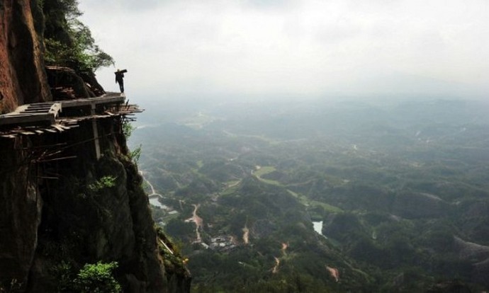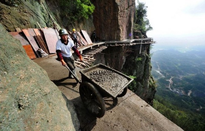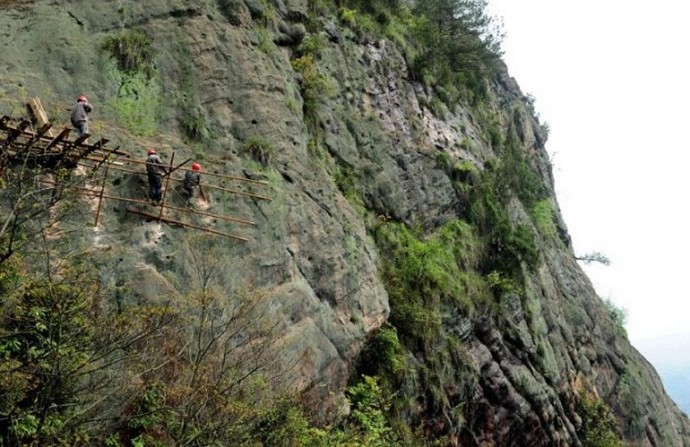 Ezen okok miatt most a Tianmen-hegység térségében a kínai a képzett kézművesek nehezen tudják javítani a lejtőn lévő ösvényeket, erősítse és bővítse őket, és újakat építsen ki. A legérdekesebb hogy ezek a nagymagasságú építők európai szempontból működnek teljesen embertelen körülmények között. Építenek néhányat romlott erdők, biztosítás nélkül működnek (ha nem számoljon sisakot az ember fején) és ugyanakkor (megjegyzés) teljesen nem félnek az életükért. Nem csoda, hogy valaki felhívott Kínai hangyák, akik engedelmeskednek valamilyen közös gondolkodásmód, teljesen nem törődve velük egyéni élet.