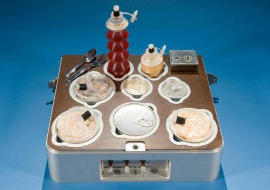 Ennek eredményeként a személyzet által végzett űrkutatás első éveiben a résztvevők járatok hordozható ételeket kínáltak. Három fogásos vacsora volt, mindegyiket egy csőbe zárták (hasonlóan a amely a fogkrémet tartja). A csőből az ételt saját magunk kinyomták űrhajós közvetlenül a szájban.