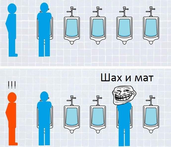 A matematikusok szigorú számításokat végeztek megállapította, hogy a legelőnyösebb helyzet a kis igények kielégítésében nyilvános mellékhelyiségben a piszoár van a legtávolabb bejárati ajtó. Ha elfoglalja, akkor valószínűleg provokál más férfiak, akik a WC-be mennek vizelni, keresztül található az egyik forgalmas. Így minden között a mellékhelyiség látogatóinak legalább egy üresnek kell lenniük piszoár. Ez lehetővé teszi, hogy az egyes férfiak ne csak személyesen viselkedjenek helyet, de be kell tartani a “WC-etikett” szabályait is az összes pisuár működése egymás után, valamint a monitorozás a szomszédok és a velük való beszélgetés elfogadhatatlan.