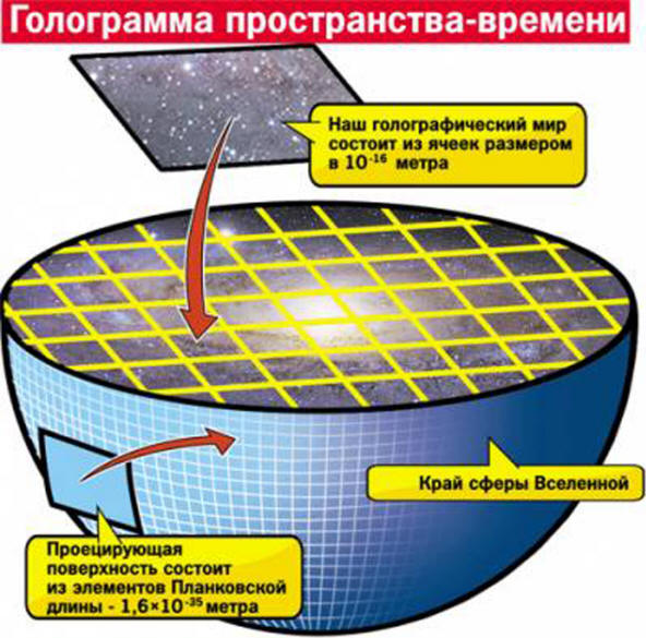 Egy tudós az univerzumot olyan gömbként reprezentálja, amelynek felülete Planck hosszúságú elemekkel borítva. És mindenki hordoz az információ egység egy kicsit. És mi van benne – általuk teremtett Hologram.