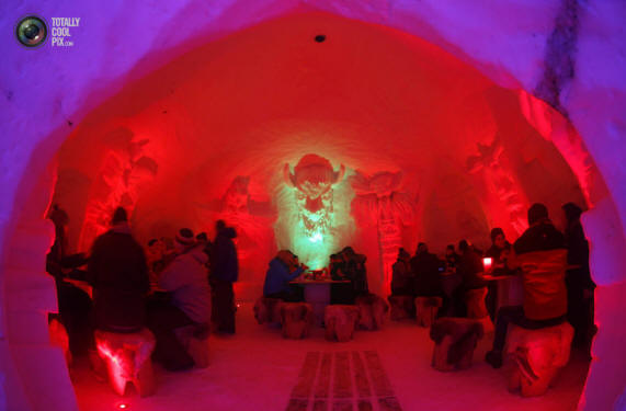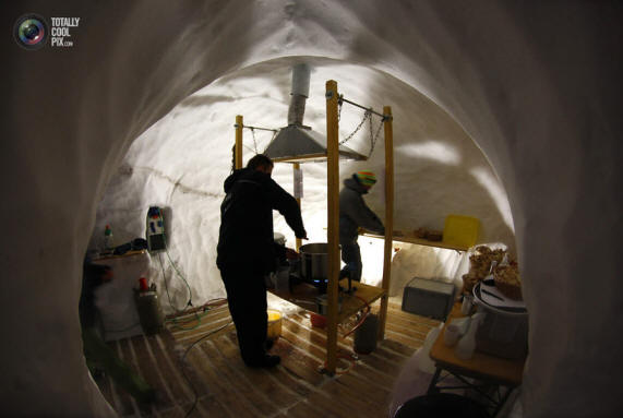 12. Az emberek egy iglu étkezőben élvezik a sajtfundurát.