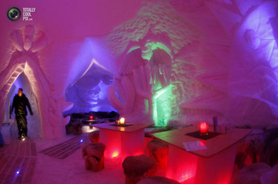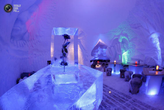 14. Jéglapokból készült bárpult, az igloo bárba beépítve világítja meg.