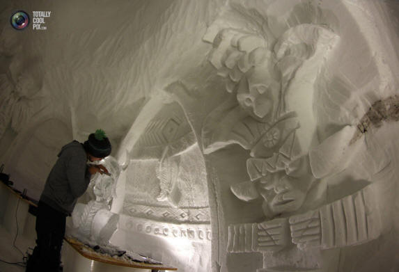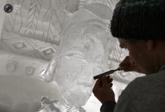 2. A munkás jégszobrokat farag a igloo faluban a Nebelhorn-hegy teteje, Oberstdorf közelében.