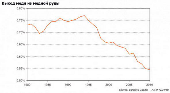– A fémekkel ugyanaz a helyzet, mint az olajjal: minden az alacsonyan lógó gyümölcsöket már betakarították. Annak ellenére, hogy új technológia, a tonnánkénti fémérc termelése továbbra is csökken. Itt van például a rézérc tonnamennyisége: