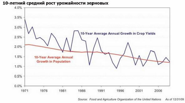 * Most, a használat jelentős növekedése ellenére műtrágyák, a hektáronkénti termésnövekedés 1960 – ban 3,5 – ről 2006 – ra csökkent 1,2 százalék jelenleg. Kevés szabad föld maradt amelybe be lehet vonni, és mint embereket egyre gazdagabbá válik, és egyre több húst esznek a gabonafélékkel. Mivel a népesség tovább növekszik egy százalék felett, az állomány kevés erő marad hátra.