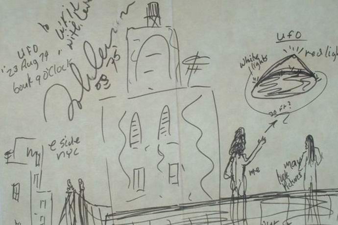 Bizonyítékokat találtak Lennon idegenekkel kapcsolatos hitéről már korábban. Például 1984-ben kiadta a “Nobody Told Me” című dalt amely a következő vonallal rendelkezik: “Egy UFO lebegett New York felett, de én nem különösen meglepett. “És tavaly Russ Kellett brit ufológus vásárolt egy magángyűjtőtől egy ritka vázlatot papírra, készült a leghíresebb és legbecsületesebb Beatle-től. tovább Ebben a vázlatos rajzban számos ház látható, Brooklyn Bridge, maga a zenész, egy közeli nő, és egy repülő csészealj is. „Fehér fények, piros lámpák” – olvassa el Az énekes aláírása egy idegen repülőgép különféle elemeire. Egyébként ez az UFO-k – ilyen objektumok – nagyon általános leírása megtalálható a föld szinte minden sarkában.