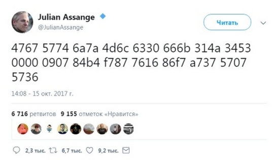 Ausztrál online újságíró, Julian Assange ( Assange), a WikiLeaks alapítója és az elmélet világhírű támogatója világszerte összeesküvés, öt évre bujkálva a fennálló hatalmaktól ezt a londoni Ecuador nagykövetségnél, tegnap közzétették a a Twitter oldala nagyon titokzatos üzenet, egyértelműen titkosítva, ami szó szerint sokkolt az összeesküvés-elméleti szakemberek számára.