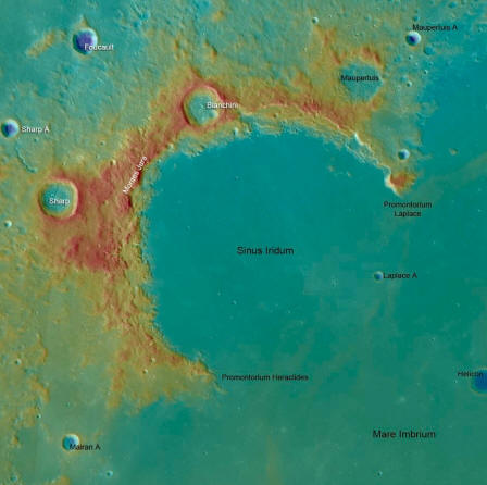 A Chang’e 3 valószínűleg egy darab holdi partra száll a Sinus Iridium nevű friss kráter közelében Laplace. (A képen ez a jobb alsó sarokban található).