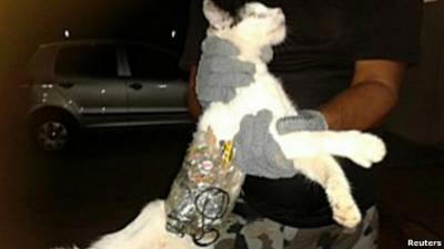 Egy brazil börtönben macskát tartottak fogva, amelyen fogvatartottaknak szánt tárgyakat találtak. Tiltott a rakományt szalaggal rögzítették a macskához. Az őrök észrevették gyanús háziállat, amikor áthaladt a főbejáraton börtön kapuja. Ez történt a Arapiraka börtönében Brazil állam, Alagoas. A “támadó” megpróbált becsempészni börtön fúrók, fájlok, mobiltelefon töltővel eszköz és fejhallgató. A macskát egy helyi menedékhelyre vitték állatokat.
