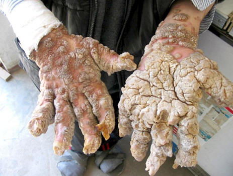 fénykép nyílt forrásokból 4. Epidermodysplasia verruciform. Az egyik ritka génhibák. Nagyon teszi a tulajdonosokat érzékenyek a széles körben elterjedt emberi papillomavírusra (HPV). Ilyen embereknél a fertőzés számos bőr növekedését okozza a fa sűrűségéhez hasonló növekedések. A betegségről lett 2007-ben széles körben ismertté vált az interneten megjelenése után videó egy 34 éves indonéz Dede Cosvaráról. 2008-ban az ember egy komplex műtéten ment keresztül, hogy eltávolítsa a hat kilogrammot növekedés a fejből, a karokból, a lábakból és a törzsből. Működtetett alkatrészekre új bőrt ültettünk át. De sajnos néhány után az időnkénti növekedés újra megjelenik.