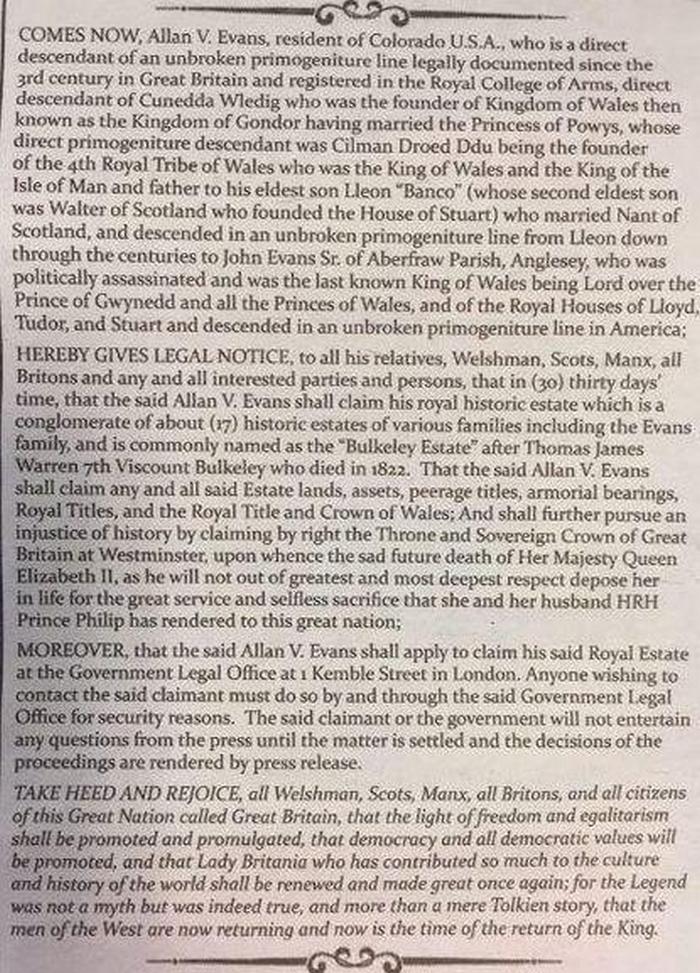 Az amerikai Allan Evans a Brit Birodalom trónját állítja, Colorado lakosa, aki nemrégiben egész oszlopot vásárolt a The Times újságot, és bejelentette, hogy jogaik vannak Angol korona (lásd a fotó megjegyzéseket).