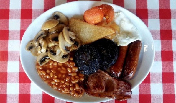A britek későn reggeliznek, de alaposan. Ebben az időben ők enni tojást, szalonnát, gombát, fekete pudingot, babot, paradicsomot, kolbászt és pirítós.