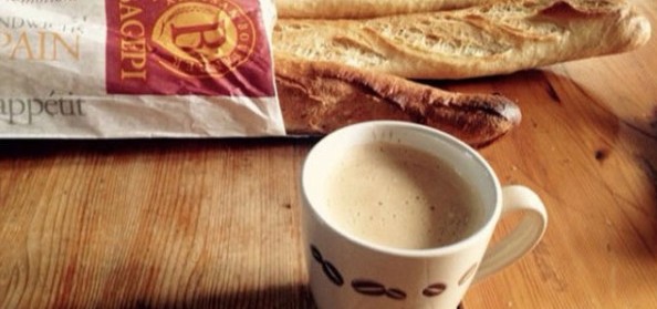 A franciák egy szendvics mellett kávét isznak, amit felhasználnak puha, éppen vásárolt baguette.