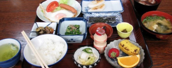 A japán reggelit a hagyományos (miso leves, rizs, nori tengeri moszat) és a nyugati (kávé, tojás, vajas pirítós, burgonya) saláta).