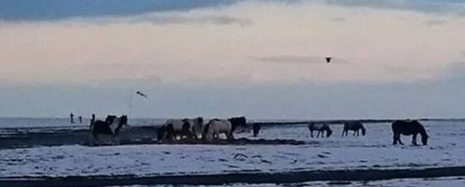 Háromszög alakú tárgyat fényképeztek a strand felett. Summerleaze strand, Buda (Cornwall, Egyesült Királyság). A második lövés, amelyet szintén Cornwallban készítettek, lebeg egy póni csorda egy furcsa gép.