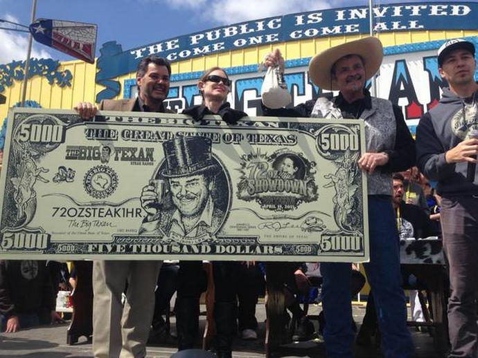 A Big Texan étterem 1960 óta tart ilyen rendezvényeket, de ezt még senki nem látta. Egyébként az intézmény társtulajdonosa Bobby Lee észrevette, hogy az étterem szabálya: bármilyen a látogató ingyen ebédelhet, de ehhez meg kell enni két kilogramm marhahús steak egy köret nem több mint egy óra anélkül, hogy felkelne volna az asztalról. Ellenkező esetben neki kell hetvenkét dollárt fizetni ennek az örömnek.