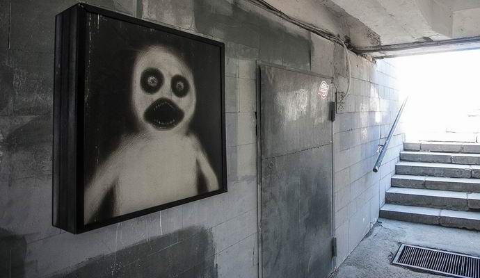 fénykép nyílt forrású aluljáróról Dimitrov sugárút alatt, Romániában Novoszibirszk orosz városa szokatlan lakosságot kapott. ott egy dekoráció jelenik meg egy képen villogó képernyő formájában kis szellem. A monitoron lévő fehér lény baljós kilátás, amely megijeszti a gyermekeket, és depressziós benyomást kelt rá felnőtt gyalogosok.
