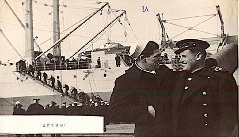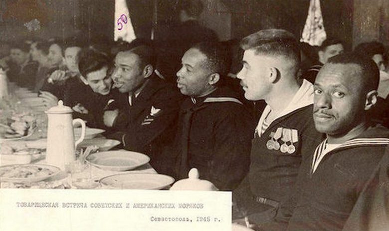 Felhívjuk figyelmét, hogy a szovjet tengerészek közöttük vannak Afro-amerikai haditengerészet tisztjei. Nagyon merész és felfedő. fénykép arra az időre, amikor az amerikai haditengerészet volt fajilag elkülönített.