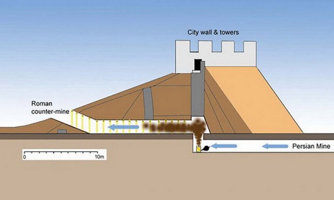 A múlt század 20-as éveiben a franciák és az amerikaiak együtt feltárta a szíriai Dura Europos városát, amelyet a perzsa elpusztított. A régészek egy ostrom-alagutat találtak, amelyen a perzsa tervezte beszivároghat a városba. A rómaiak ástak egy pultot – normális gyakorlat harcolj az ellenség alagutakkal. És itt van két alagút találkoztam.