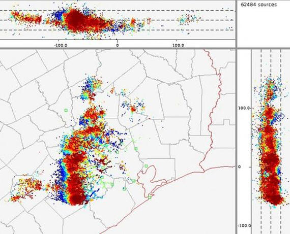 Az esemény értékeléséhez megtekintheti az órás térképet. A villámcsapásokat itt mutatjuk be a modell szerint – felhő-föld és felhő- felhő Houstontól 100 mérföldre.