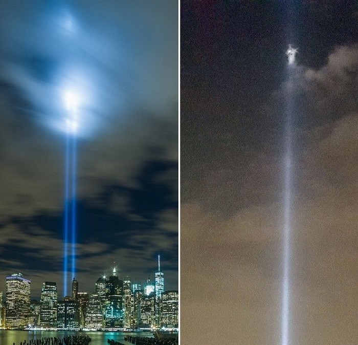 Egyesült Államok kormányzati ünnepi ünnepe a 2001. szeptember 11-i támadás évfordulója a tönkrement világkereskedelmi központ több ezer amerikai, akik csodálkozva nézte, mint ahogyan számos reflektorfény sugaraiba esett vizuálisan megismételte az ikertornyok kontúrjait.