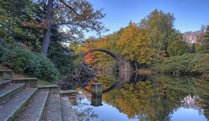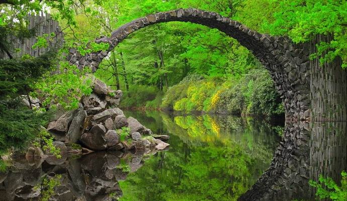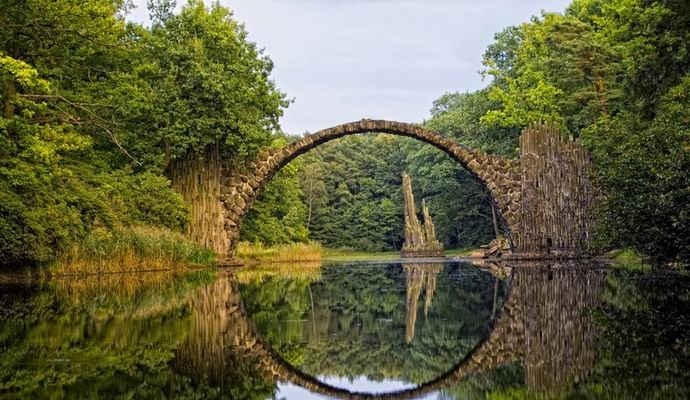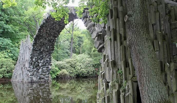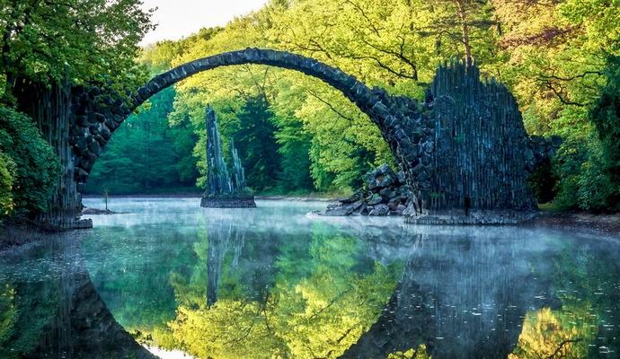 Nézze meg a felszíni bazalt ívet Kromlau-ban turisták az egész bolygóról. Az 1860-ban épült híd lenyűgözi még a modern építészeket is pontosság. Ha a folyó vízszintje eléri a kívánt szintet, Rakotzbrücke és az alábbiakban tükröződés tökéletes kört alkot, amely bármilyen szögből jól látható.