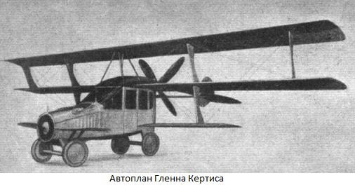 Ezt az “Autoplan” a repülés egyik úttörője építette Amerikai Glenn Curtis. 100 LE, szárnyszélesség – 12m, hogy mind levegőn, mind szárazföldön mozogniuk kellett volna, a hátlapra szerelt négylapátos légcsavar segítségével. Az autó repülőgép soha nem repült, teljesítménye csak néhány lehet rövid ugrások. Csak akkor említjük őt, mert az volt első kísérlet.