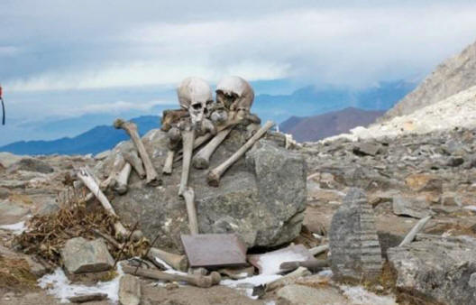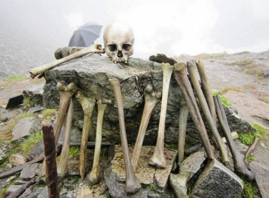 Roopkund – egy jégtó, amely magasságban helyezkedik el körülbelül 5 029 méterrel Uttarakhandban, Indiában. Amikor a jég megolvad több száz emberi csontváz jelenik meg a felszínen, vagy úszik be vizeken. A tót először 1942-ben fedezte fel egy erdő vadászati tartalék, bár ezeknek a csontoknak a megemlítése megjelent század vége. Eredetileg úgy vélték, hogy a maradványok Japán katonák, akik elindultak a körzetbe, majd belehaltak hód szörnyű időjárással.
