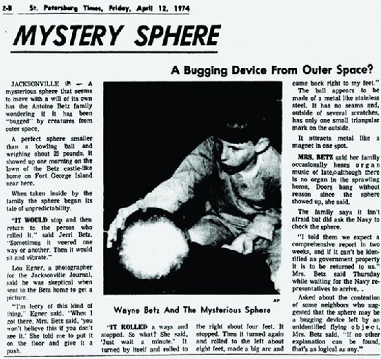 Ez Floridában, Jacksonville városának közelében történt. 1974 március végén, a múltbeli erdőtüzek után a család Betz, aki földet sértetlenül vizsgálta, találkozott körülbelül 10 kilogramm súlyú csiszolt fémgömb és alig 20 centiméter átmérőjű. Nincs sérülés ott nem volt, bár volt egy 3 mm-es háromszög jel. Meglepő volt, hogy a labda még a fogakat sem hagyta a földben, ám mégis sehol nem jelenhetett meg, csak azért, hogy leesett az égből.