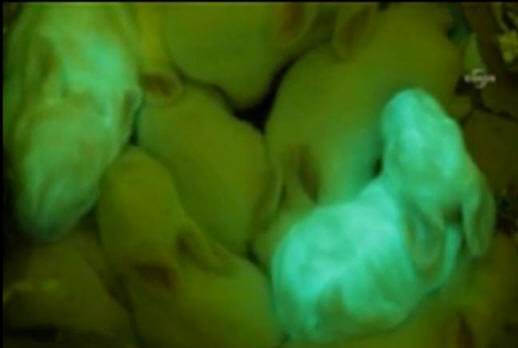 Fotók nyílt forrásból A tudósok bemutatták az egyik gént a sertéseknek spenót, amely átalakítja a benzinben található telített zsírokat sertéshús egészségesebb és könnyebben emészthető telítetlen zsírokba (linolsav). Bár a tanulmányok még nem tártak fel szövődmények a genetikailag javított sertéshús fogyasztásakor, a hús hitetlen ellenfelei valószínűleg nem fogják tetszeni – mert csak zöldségeket fogyaszthat helyett feltalálni a “növényi húst”. 10. Sötétben izzó háziállatok Hallott már egy ragyogó nyúlról? Azóta 2000-ben született, fáradhatatlanul genetikával kísérletezni különféle állatokkal, felmutatva nekik a képességet sugárzást bocsát ki.