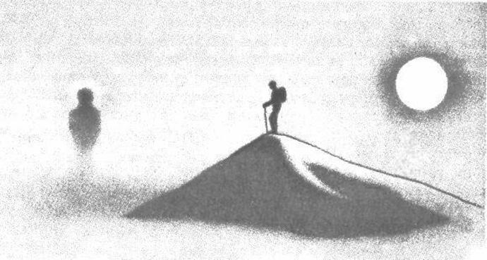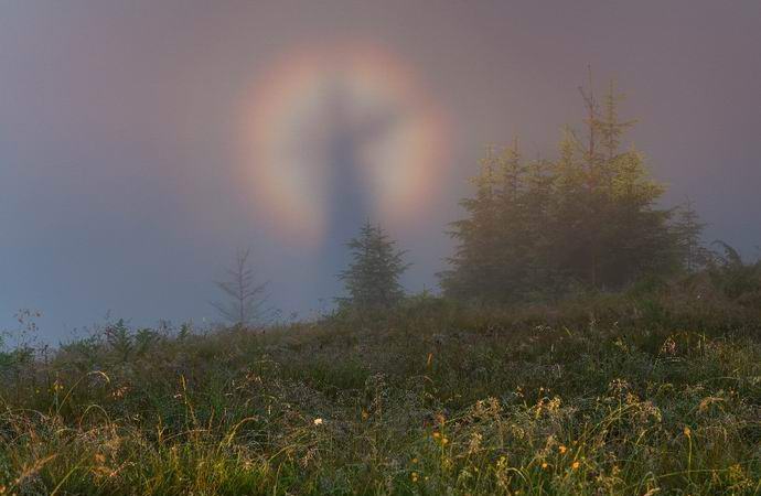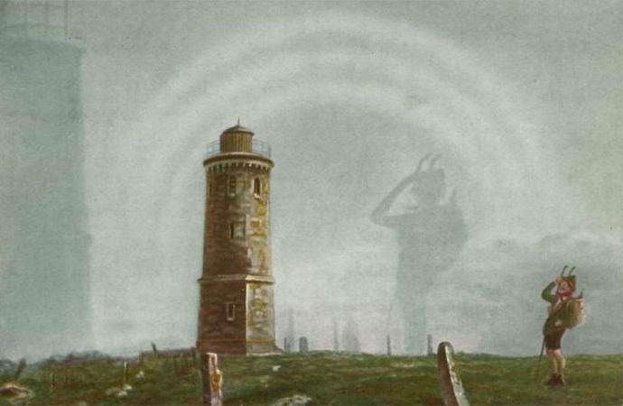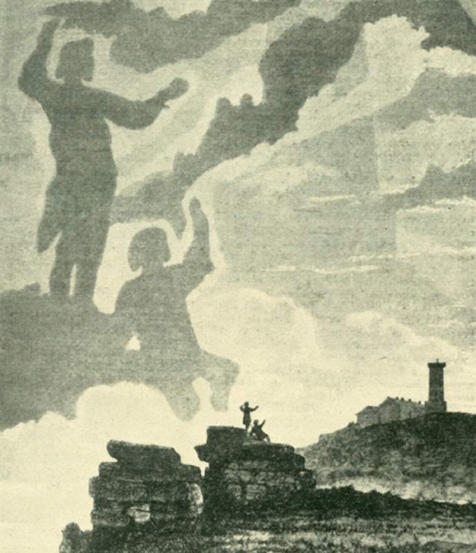 Például létezik egy középkori német legenda egy pásztorról, aki a rablóktól menekülve, a hegyre rohant. Elkaptam megtakarítva a kövek gerincét, megállt, hogy pihenjen, és észrevette alatta felhők, amelyek félelemtől rázta meg. felett A lejtő lefelé állt anélkül, hogy megérintette a talajt, hatalmas sötét egy ember, amelyet kissé eltakart a köd. A lába beleesett kavargó felhők.