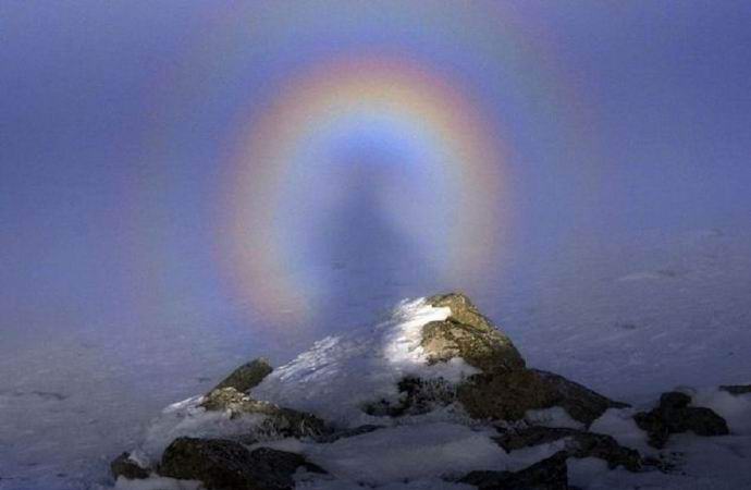 A törött szellemet általában szivárványgyűrűk veszik körül. Az a fény diffrakciója miatt fordul elő – a nap sugarai törnek vízcseppekben, szétoszlatva a szivárvány színét.