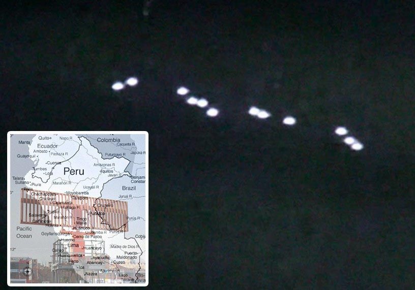 Tizenkét gömb alakú UFO törött vonalban sorakozott fel, valódi felfordulást váltott ki a repülőtéri alkalmazottak körében, tehát ezt az eseményt a perui Corporation hivatalosan rögzítette kereskedelmi repülés. Minden objektumhoz egyedi, nem mindenki ismeri a 0000 kódot, ami azt jelenti, hogy ez egy UFO, magyarázta Mario Zegarra ufológus, állítva, hogy van jegyzete diszpécserek tárgyalásai, valamint egy videó az UFO-sorozatról IR kamera, mivel ez a titokzatos repülés képes volt csak radaron vagy infravörös videókon rögzíthető sugárzás. Ez az oka annak, hogy még az interneten sem vannak videók ez elég sokat kiderült, és természetesen mindenkinek megvan okostelefonok kamerákkal …