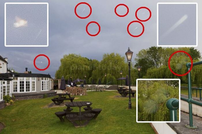 Ezután átnéz minden, amit egy nap elfogott a számítógépen, meglepetésére a fotós észrevette a kettő egyikét öt gömb alakú UFO van, amelyek világos farokat dobnak. felett a bankett-csarnokot, és teljesen hengeres tárgyat lógott fel háromszög alakban szárnyakkal, és egy zöld kerítés lombozatával kettő áttetsző golyó. És mindez csak egyre van nyomtatva a képen, a másodikban – minden tiszta volt. Valami miszticizmus! A briteket mindez egyszerűen megdöbbentette, mert hibák voltak kizárja a fényképeket: mint profi ebben a kérdésben, egyszerűen nem teszi meg megengedheti nekik …