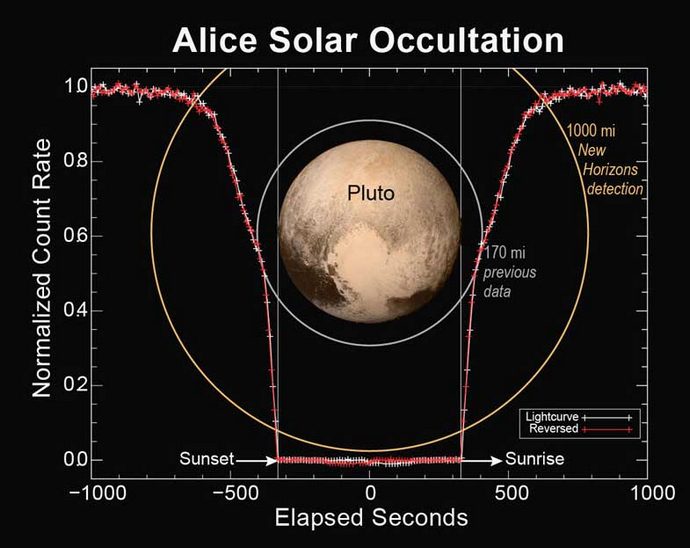 A grafikonon: egy bizonyos távolságra a bolygón a szám az Alice spektrográf által kapott fény hirtelen csökkenni kezd, mert a Plútó atmoszférájának molekuláris nitrogénje abszorbeál néhányat a csökkenő napfolyam része. Amikor közeledik A törpe bolygó felületén a fényintenzitás még mindig csökkent élesebb, nyilvánvalóan a napfény intenzív abszorpciójának köszönhetően a Plútó atmoszférájának szénhidrogén gázmolekulái.