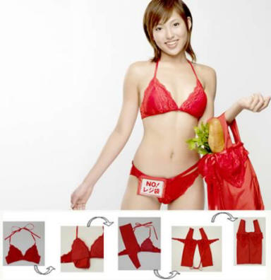 Ebben a teljesen őrült találmányban a technikát alkalmazzák. origami és furoshiki (Furoshiki, ha valaki nem tudja – ez japán fürdõszőnyeg multifunkciós táskává válik nedves ruhák). Az újrahasznosítható táska átalakul melltartóban és alsónadrágban.