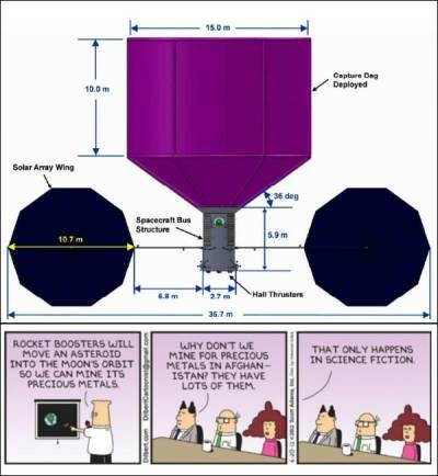 Az Űrintézet égisze alatt tartott szemináriumon Keck (USA) kutatás, a lehetőségek hozzávetőleges kiértékelését kapta a Föld közelében repülő aszteroida elfogásának szervezése tovább helyezve a pályára a hold körül, és az azt követő erőforrásainak felhasználása különböző igények kielégítésére. Kis méret egy aszteroida van kiválasztva, hogy illeszkedjen a 15 méterre 20 tonnás robothajó birtokosa. (Itt és lent) illusztrációk: KISS, Scott Adams, Universal Uclick.) Az osztályozás a következő: ilyen robot küldetés költséggel történő elküldése összehasonlítható (2,6 milliárd dollár) a Curiosity (2,5 milliárd dollár) küldésével a Mars. Ehhez javasoljuk, ahogyan a Curiosity is, használja az Atlas V rakétát (az első szakasz, emlékeztessünk orosz gyártású motorokkal felszerelt). Visszavonás után az eszközt ion xenon motor hajtja meg, 40 kW napelemes. Lassú elkezdi a sebességet a legközelebbi aszteroida felé, egy kirándulás, amely másfél évig tart. Hogy megkönnyítsük Az első rögzítés feladata, hogy jobb egy kis objektumot választani célként 6–7 m átmérőjű, rögzítse és vontassa (ugyanaz az ion motor) egy kis testet egy holdpályára nem szabad elvinni több mint 2-6 év. Ebben az esetben, a szerény méret ellenére, az aszteroida körülbelül 500 tonna tömegű lesz a következő évtized végére be kell fejezni. Közepes 500 tonna az aszteroida mintegy 200 t szilikátot, 100 tonna vizet, további 100 tonna vizet tartalmaz a szénvegyületekből származik, végül 90 t fémek, amelyekben a vas, nikkel és kobalt dominál. mert Mi a legracionalistabb ezeket használni? A legjövedelmezőbb egy lehetőség lenne egy űrbázis építése a Lagrange-ponton L2, a holdtól 61 000 km-re. Ennek eredményeként egy holdpályán a tömeg 28-szor nehezebb lesz, mint az űrbe jutó elsődleges automatizált küldetés, és ez drámaian csökkenti a költségeket az alapanyag építéséhez szükséges anyagok szállításáról. Ha a készlet 500 t Az alap bázisának L2-es pont felé történő eljuttatása a földtől 20 milliárd dollárba kerül hasonló küldetés fogságban lévő aszteroidával majdnem lesz nyolcszor olcsóbb. Mint láthatja, az ötlet fogalmi szempontból megfontolt. több mint egy évszázados kitartás: elvtárs elvtárs hasonló gondolatokat is kifejlesztett. Ciolkovszkij.