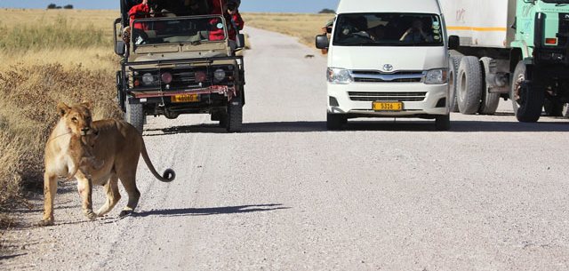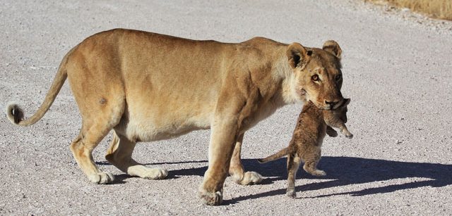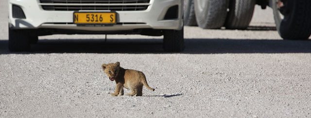 Ezeket az egyedi képeket Matthew Weaver autós vezette, akik tanúi voltak az Etosha Nemzeti Parknak A Namíbiai Nemzeti Park motorkocsiján egy oroszlán hiányzott kölykeivel az út túloldalán. A sofőrök ugyanakkor sietve lélegzetben figyeltek szinte tragikus helyzet kialakulása.