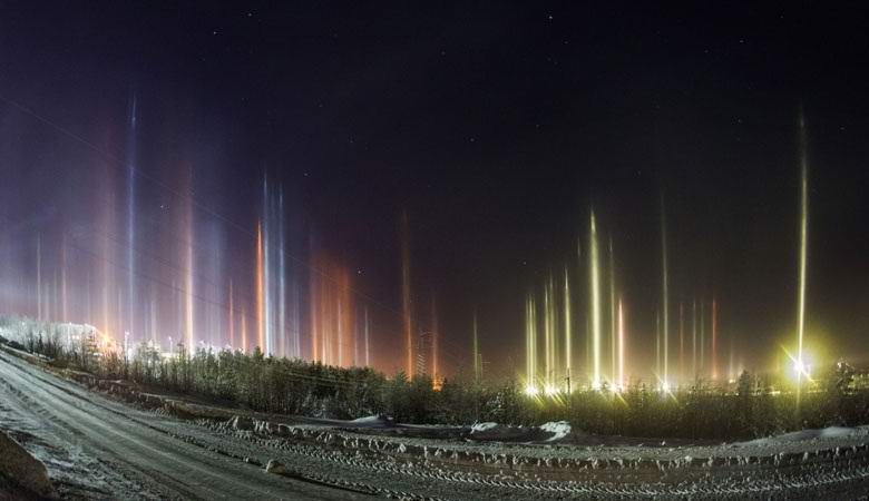 Fényképezte az aurora borealis és a fényt nulla alatti 30 fok alatt oszlopok – többszínű csillogó csíkok, amelyek úgy emelkednek, mintha láthatár az ég felé. Ezt az optikai hatást a visszaverődés okozza. a talajból származó fény a jégkristályokban a levegőben.